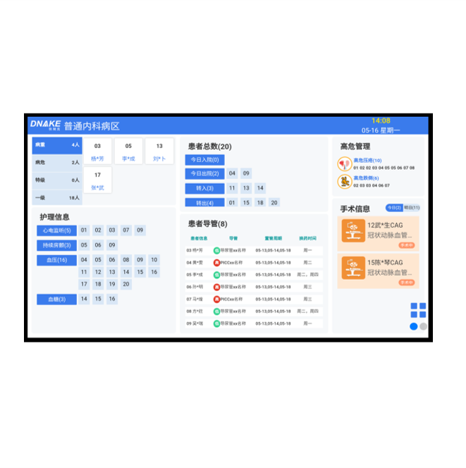 創(chuàng)新主要部署于病區(qū)護士站,用于顯示區(qū)域病房內(nèi)病床相關信息,并對報警情況做出相對顏色塊提醒,同時伴隨醫(yī)護值班情況及安排等操作??娠@示科室病房的住院人數(shù)、空閑床位數(shù)、護理等級人數(shù)、護理交接班情況、值班的醫(yī)護人員以及要事留言,完全取代傳統(tǒng)記事板。軟件參數(shù):支持顯示出入院統(tǒng)計、 根據(jù)護理等級分類查詢不同患者的床位數(shù)和總人數(shù)、支持護理信息查詢不同床位、支持患者導管信息查詢