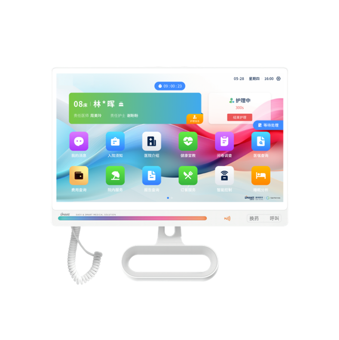 安裝在病床旁的支架或者搖臂上,用于顯示患者各項(xiàng)信息和報(bào)告,便于醫(yī)生和患者查看,具備各項(xiàng)娛樂功能,也可做娛樂設(shè)備試用,減輕患者住院焦慮。